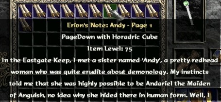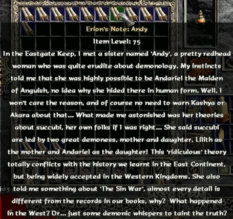 Newly added Item Type in version 3.1, used for describing story line or other features. As for ‘Erion’s Note’ Series, they would figure out some conflicts between Blizzard’s Old Canon and New, as I’m always preferring the Old Canon of Diablo story… And, something added of my own are also descripted in ‘Erion’s Notes’, such as my understanding of ‘Sirens’. These pages my drop from related monsters as extra body parts, you can collect them for reading. More of them would be added in later updates 🙂