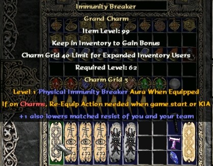 - Immunity Breaker: 'Grand Charm', Randomly breaks one type of monster immunity and lowers the matched resistance of you and your team. Almost same as D2R, but can only equip one piece. Technically, I can make ALL 6 types of them, but would cost more than 12 most precious state table rows, it's a great waste that I can't afford.